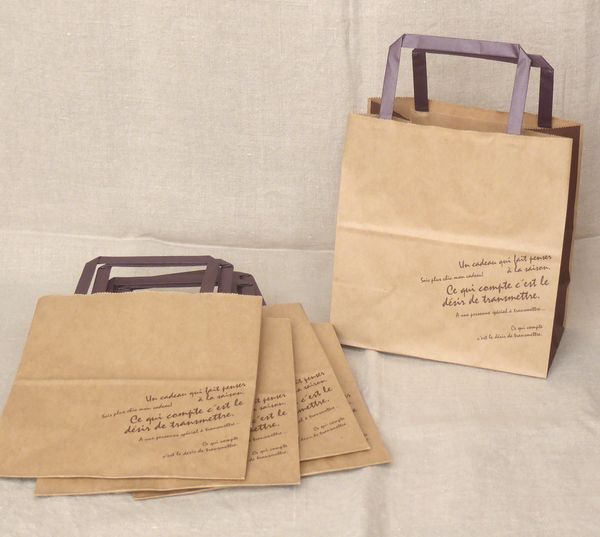 ![]() ペーパーバッグ クラフト素材の落ち着いたデザインの紙袋です。 横18㎝ 深さ19㎝ まち10㎝ 5枚 330円 ![]() |