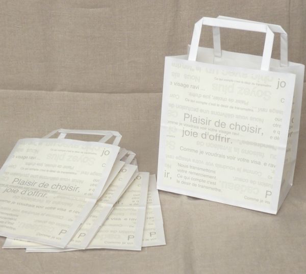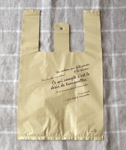 ![]() レジ袋 ベージュ地に茶色のフランス文字入り 横20㎝ 縦33㎝ まち12㎝ 10枚 130円 ![]() |