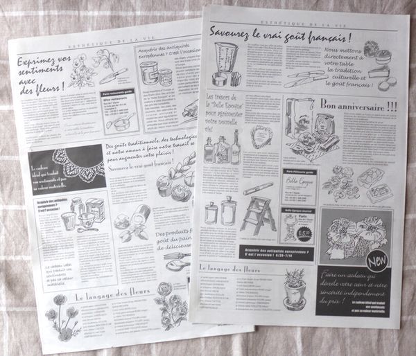 ![]() ニュースペーパーの包装紙 新聞紙と同じ紙質です。 花やお菓子のイラストが描かれています。 54×40㎝ 20枚 290円 ![]() |