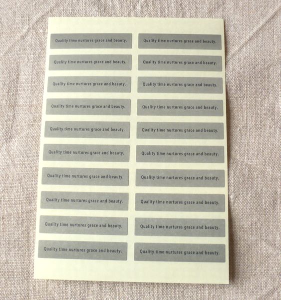 ![]() ギフトシール ワンポイントにお薦めの小さなシールです。 文字の訳は 「いい時間は 私を優雅に美しく育んでくれます」 シール1枚の大きさ:横4㎝ 縦0.8㎝ 2シート 160円 ![]() |