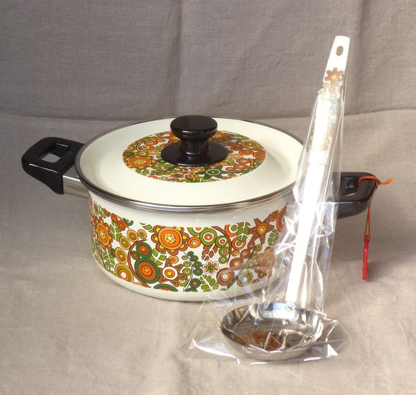 ![]() ホーロー両手鍋 デッドストック(新品)のお鍋です。 熱伝導が高く、効率良く調理出来ます。 お鍋と同じ柄のお玉付き。 直径20㎝ 4500円 ![]() |