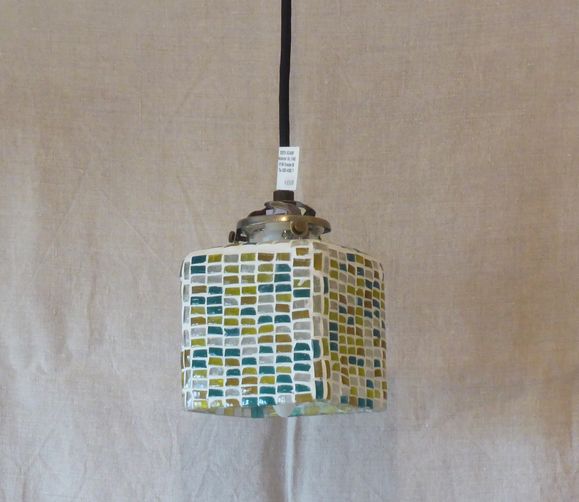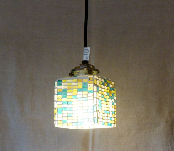 ![]() ![]() ペンダントライト ガラスのモザイクタイルで作られています。 横10㎝ 奥行10㎝ 高さ13㎝ 9500円 ![]() |