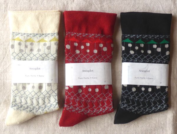 ![]() ![]() ![]() ![]() 「hacu」の新作ソックス 『Aneqdot + hacu 山の恵み』 色はホワイトミスト、アカフジ、オーロラブラック 23~25㎝ 1600円 ![]() |