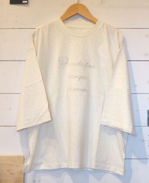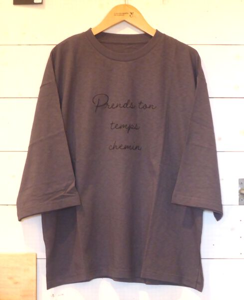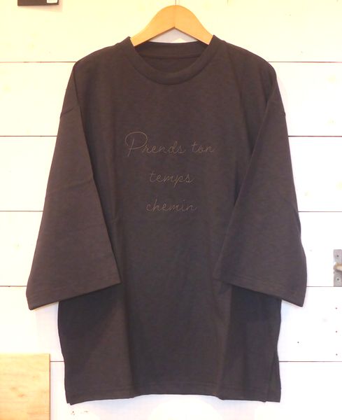 ![]() ![]() ![]() 七分袖Tシャツ 刺繍のロゴ入りデザインです。 裾サイドにスリット入り 色はアイボリー、チャコール、スミクロ 身幅58㎝ 着丈65㎝ 2200円 ![]() |